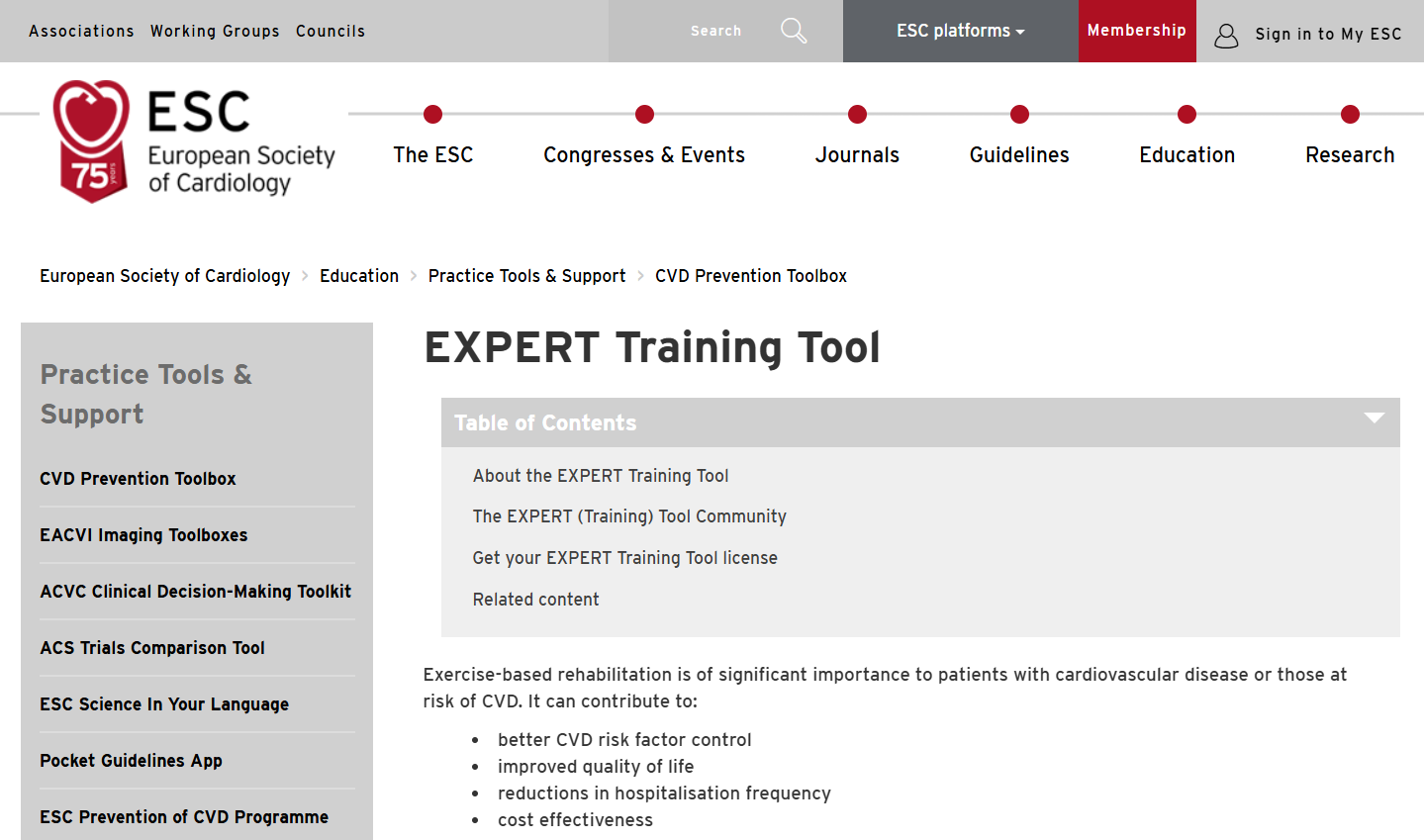 The EXercise Prescription in Everyday practice & Rehabilitative Training (EXPERT) tool is a system that provides a personalised exercise prescription for cardiovascular diseases that follows the latest EAPC recommendations and evidence. This system assists physicians and healthcare professionals in choosing and adopting the optimal exercise intervention in patients with various CVDs and/or a combination of risk factors.